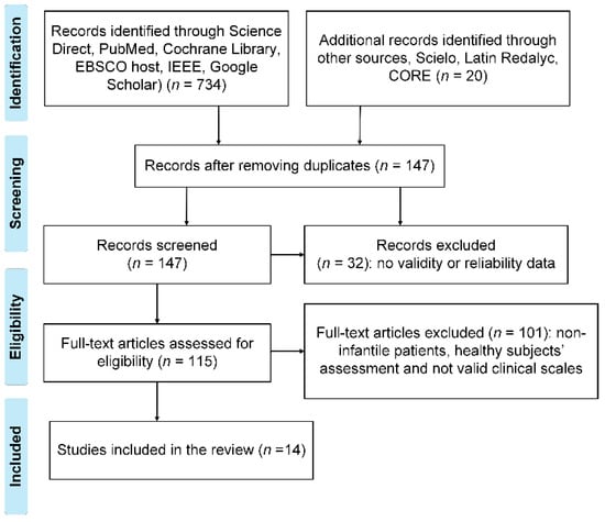 Figure 1 shows the selection of studies with the articles screened and the selection process according to the PRISMA format. Several studies performed quantitative assessments of cases other than CP during the data extraction; therefore, 32 studies were excluded. In addition, we found assessments involving non-child patients and healthy subjects; therefore, we discarded 101 such studies. Similarly, after a consensus among the authors, we decided to include two studies that did not mention any clinical scale. However, these studies provided valuable information for the quantitative assessment of this study population. Finally, 14 primary papers were selected for the analysis. The references of the selected studies were grouped and formatted using the EndNote (Clarivate Analytics, London, UK) reference manager.