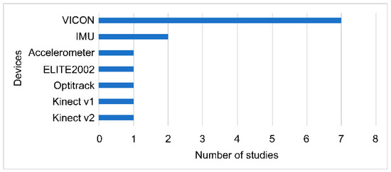 Motion capture systems based on optoelectronic devices (Vicon systems) (Oxford Metrics Group, UK) are considered to be the gold standard for a motion analysis. However, the analysis requires sending patients to a clinical laboratory and is most commonly used to assess kinematics and spatiotemporal variables during activities such as reaching and grasping [55,56,57,59,62,64,66]. Wearable inertial sensors also directly measure kinematic data of the human body and are an alternative able to be used both in the laboratory and in an open environment [61,63,67]. Another less expensive alternative with more advantages is the use of Kinect devices (Microsoft, Redmond, WA, USA) [60,65]. The frequency of using quantitative evaluation methods for both the AROM and kinematics in primary studies is presented in Figure 2.