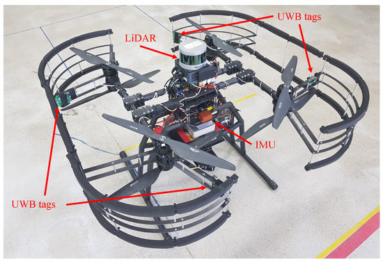 The proposed UAV platform equipped with four UWB tags, an IMU sensor, and a LiDAR sensor for groundtruth measurement.