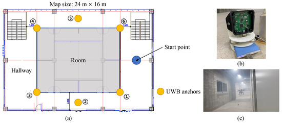 (a) The floor plan of the experimental site and the locations of UWB anchors. (b) The mount for the UWB anchor. (c) The scene of the real-flight experiment.