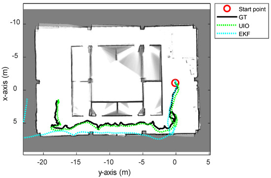 First of all, the proposed UWB-inertial odometry algorithm based on IMM (UIO) was compared with the traditional tightly coupled UWB-IMU EKF method. In the EKF algorithm, the NLOS factor is not included in the state vector (5). The system model is a single kinematic model, so the position and orientation are updated by the EKF filtering at the same time. The proposed UIO algorithm has an advantage in the case of estimating the state of robots with complicated motions such as UAVs. Figure 5 and Table 2 show the comparison result between the UIO and the tightly coupled EKF. The trajectory estimated using the EKF method could not follow the groundtruth path when the UAV entered the first corner.