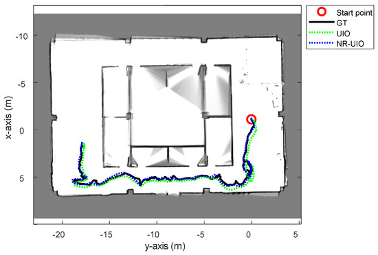 The overall trajectories estimated using only the UWB-Inertial odometry (UIO) and the proposed NLOS-robust UWB-Inertial odometry (NR-UIO).