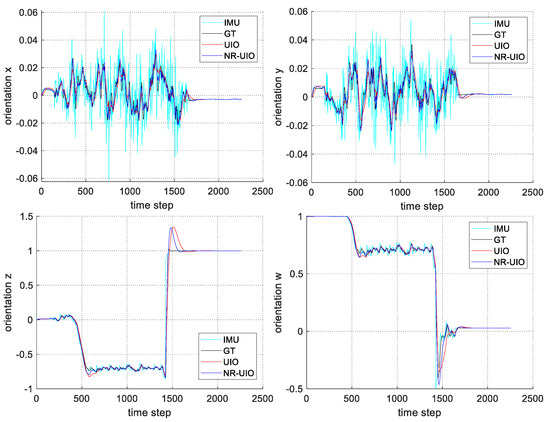The comparison of the estimated orientation quaternion components (x, y, z, and w) with groundtruth.