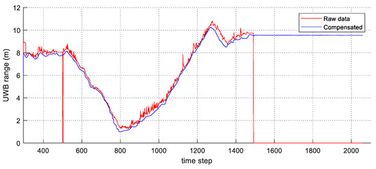 - Estimate the NLOS factor of the UWB raw range input through the IMU/UWB alignment process detailed in Section 3.5. The UKF is employed to estimate the NLOS factor. From the NLOS factor, if it is determined that the UWB range input data are from the NLOS situation, then the data can be removed or compensated to increase the robustness in the NLOS situation. The measurement, , selected through this process is used in the measurement update step.