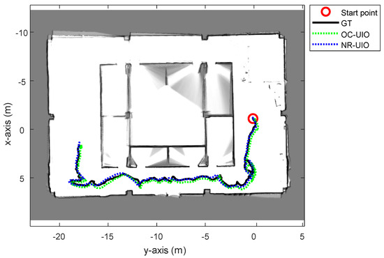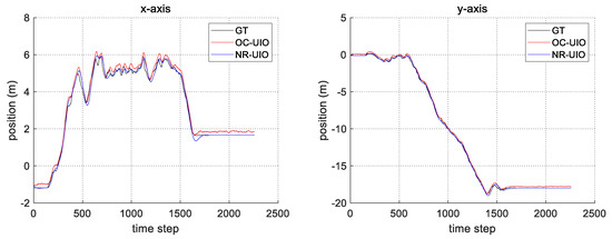 In this section, we perform a comparison between the proposed algorithm and the state-of-the-art (SOTA) algorithm. The selection criteria for the SOTA algorithm is the method with the highest localization accuracy among studies that have performed localization through UWB’s NLOS effect identification and mitigation published within the last two years. The study selected as the SOTA discussed compensation of UWB measurement, including unknown offset [34]. In [34], the unknown offset of UWB range measurement was estimated using a discrete-time formulation of the system dynamics. Under such a condition, the offset can be estimated in an optimal number of steps regarding the number of UWB anchors. In this experiment, the NLOS factor (or offset) was estimated using the formulation of the SOTA algorithm and our proposed algorithm. Then, the NLOS factor estimated by those methods was applied to the UIO. Figure 10 and Figure 11, and Table 3 show the comparison result between the SOTA algorithm (OC-UIO) and the proposed algorithm (NR-UIO). The abbreviation ‘OC’ means offset compensation.