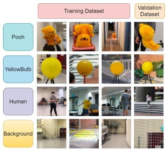Our model aims to detect three classes of objects (i.e., Winnie-the-Pooh soft toy, yellow bulb ball and human). The human class usually appears as the target object in a surveillance mission, while the other two classes are included for experimental convenience. To improve the detection performance of the trained model, the custom dataset should contain images with random and dissimilar illumination conditions, scales, view of angles, aspect ratios, resolutions, and backgrounds. Additionally, it is also considered that the system could be integrated with other custom-trained models for specific surveillance missions. We established a dataset including 13,500 images, composed of 2000 training images plus 500 validation images (4:1 ratio) for each class, as well as 6000 background images with no target object. The 6000 background pictures are designed as negative images to raise the model’s accuracy because it will learn to detect no object in a scene, thus reducing false positive (FP) results. Additionally, within the training dataset, many images contain multiple objects (i.e., Pooh, yellow bulb ball, human) in a single frame, which would enhance the detection accuracy in the scenario that multiple target objects appear in the same scene. Some representative images of our dataset are shown in Figure 3.