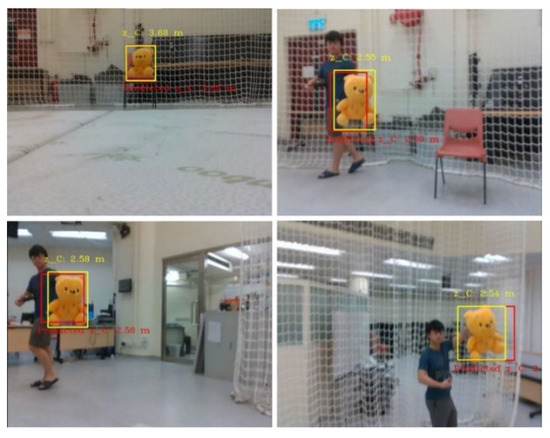 The flight tests were conducted under a Vicon arena with the size of 6 m × 4.6 m. To simulate a surveillance mission, we have assigned the UAV to search, track, and follow the “Pooh” class object. During the experiment, we tried to move the target object around while the quadrotor maneuvered in order to track and follow the object. Both object and camera were constantly moving such that the difficulty of pose estimation was raised. In addition, we also included occlusion scenarios, as we intentionally trespassed the space between the UAV and the object. Furthermore, due to the cluttered environment, the parameters were conservatively set for safety reasons. Table 4 shows the values of the tuned parameters.