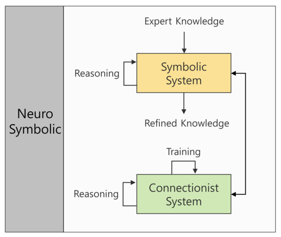 Neuro-symbolic approach: Connecting the symbolic system which outputs refined knowledge by reasoning the expert knowledge input in a symbolic representation format with the connectionist system which trains.