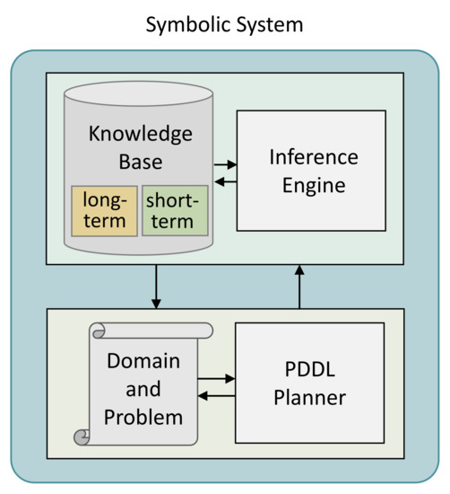 The symbolic system of the proposed neuro-symbolic framework follows the ROSPlan [52], which is a robot operating system (ROS)-based automated planning method. The symbolic system designed in this study is shown in Figure 2. The knowledge base stores all of the long-term and short-term data. Long-term data comprise environment information expressed with symbols or agent information including performance, possible movements, and roles of different multi-agents. Short-term data comprise information acquired in real-time during task planning. In the interface engine, only the information required for executing given tasks is extracted from the knowledge base. The extracted information describes the PDDL domain and problem and generates actions of agents through a planner. Unlike conventional methods, the acquired information of multi-agents can be merged and new information can be inferred through reasoning by using the knowledge base in planning. A new PDDL problem can be automatically generated when re-planning is needed while executing tasks, since the changed information is updated in the knowledge base. Thus, the success rate of task execution can be increased.