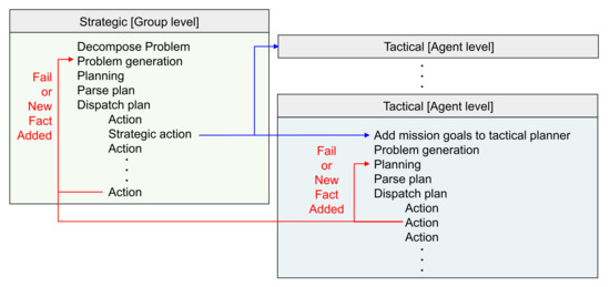 Strategic–tactical planning [53] is used for generating the sequence of actions of multi-agents in a wide area. The multi-agent system in this study consists of a central operating system (COP) which oversees the entire system by dividing the agents into groups for the operation. Groups are controlled at the strategic level, while each agent is controlled at the tactical level. The COP and the main agent of each group have a planner for hierarchical level planning. Therefore, strategic-level planning is executed in the COP planner, while tactical planning is executed in the planner of the main agent of each group. The overall process is as shown in Figure 3. First, the entire mission is divided into groups at the strategic level, problems are generated, and then a plan is generated using the COP planner. Subsequently, the generated plan is parsed, and then action and strategic action are dispatched to each group. During strategic action, the actions of all agents belonging to each group are planned in the planner at the tactical level, and the results are parsed and dispatched.