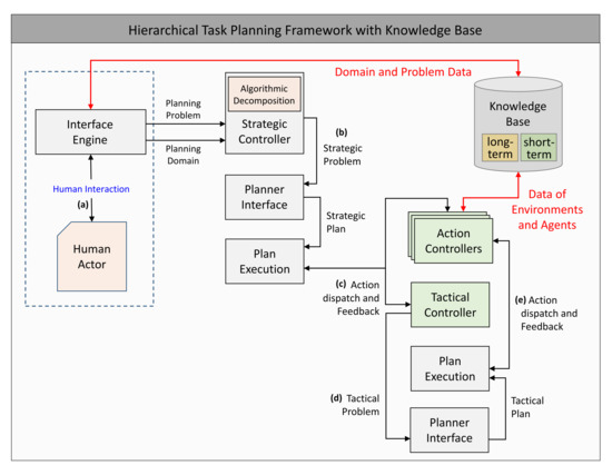 The hierarchical framework for strategic–tactical planning shown in Figure 3 is as shown in Figure 4. Using domain-dependent information saved in the knowledge base and task goals given by a human actor, the PDDL domain and problems are automatically generated in the interface engine to be approved in a strategic controller. Algorithmic decomposition for the problem allocation of a multi-agent system at a group level is executed in the strategic controller, and the results are delivered as a planner interface and plan execution. The plan execution process at the strategic level is as shown in Figure 5. A strategic plan consists of an action and strategic action, while a strategic action consists of actions at the tactical level. In the tactical controller, a plan is generated by receiving the strategic action and is executed through the action controller.