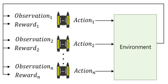 The essence of deep reinforcement learning is that agents interact in operating environments and the sequential decision-making problem is solved through a trial and error approach. Based on the observation from the environment and consistent interactions through a reward as shown in Figure 6, the policy is improved to maximize the gain of the reward. In most multi-agent reinforcement learning (MARL) systems, the policy of each agent is learned through mutual cooperation or competition between multiple agents, where all other agents are considered as an environment from the perspective of one agent. Consequently, each agent is operated independently. However, since a multi-agent system needs to behave organically in order to achieve a certain goal, a graph neural network (GNN)-based reinforcement learning approach [44] and multi-agent deep deterministic policy gradient (MADDPG) [45] approach for simultaneously training multiple agents are used.
