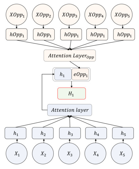 Two cooperative–competitive teams with different goals are configured in the same environment. Each multi-agent is represented as a graph consisting of nodes and edges, in which the features for the interaction between agents are effectively extracted through a GNN. Figure 7 shows the overall neural network architecture, where the interaction between five agents in a cooperative relationship and five agents in a competitive relationship among a total of 10 agents is represented from the perspective of one agent.
