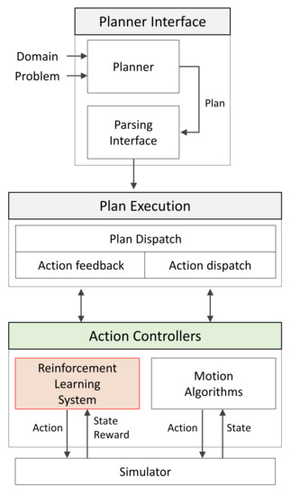 In this section, a planning system that integrates a hierarchical task planning framework and cooperative–competitive reinforcement learning is discussed. The plugin-based neuro-symbolic framework is as shown in Figure 8. In the planner of the planner interface, a plan is generated by receiving the PDDL domain and problem. A plan signifies the sequence of actions of agents and is delivered to plan execution through a parsing interface. In the planned dispatch, one action that must be performed by each agent of the multi-agent system is sent to the action controller, and all sequences of actions generated through action feedback are delivered. The action controller consists of a reinforcement learning system and motion algorithms and maps the motions that must be performed in a simulator. For motion control in a fast and dynamic environment, corresponding motion algorithms are used in the static environment using the reinforcement learning system. Unlike conventional reinforcement learning methods, our algorithm needs to define the domain in advance. Existing symbolic methods can be used for task planning without learning time, but our method requires time for motion training. However, through the proposed plugin-based neuro-symbolic framework, task planning is solved with a symbolic approach in a wide area and with a connectionist approach in a constantly changing environment.