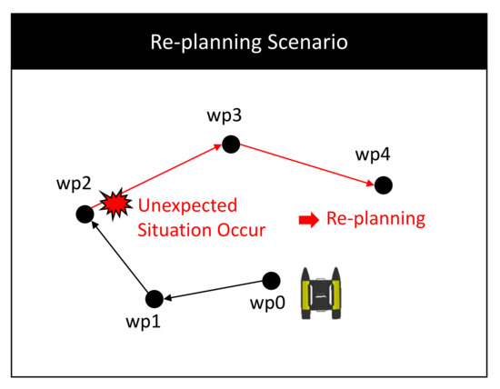 Simulation scenario for re-planning: One USV moves while performing reconnaissance for the given WPs. It was assumed that the mission fails as an unexpected situation occurs at wp2 and it is verified whether re-planning is successfully executed.