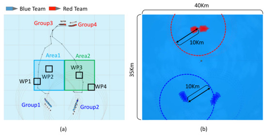 The proposed framework was verified in the environment shown in Figure 11. The size of the entire area in which the task was executed is 40 km × 35 km, in which a total of 20 USVs and one COP for controlling all agents were operated. ROS Gazebo based on Ubuntu was used for configuring the task and the simulator for agents, while Windows-based Microsoft Foundation Class (MFC) was used to build the COP system. The blue team and red team each had 20 non-holonomic USVs, where the task was executed in two groups. Each agent was equipped with LiDAR, meaning an object could be detected from up to 10 km. Furthermore, the blue team could eliminate the agents of the red team within 1.5 km. Each agent had a “move” action that allowed movement between points, a “detect” action that allowed the detection of the opponent, and an “eliminate” action that allowed the elimination of the opponent. The task for the blue team was to block the red team, which moved downward while performing surveillance on WPs, while that of the red team was to move to the destination along the given path. The path to the given destination was set in advance, and the red team moved on this path. A surveillance scenario that guarded a specific area while observing the opponent was used to implement the proposed framework.