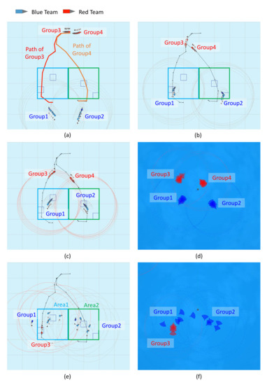 Simulation results of the proposed neuro-symbolic framework: (a) initial state, (b) blue team performing surveillance in a wide area based on symbolic approach, (c) blue team executing surveillance task output from the COP system, (d) blue team executing surveillance task in the Gazebo environment, (e) group 1 responding with a symbolic approach output from the COP system and group 2 responding to the red team with connectionist approach, (f) group 1 responding with symbolic approach in Gazebo environment and group 2 responding to the red team with a connectionist approach.