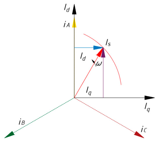 The basic idea of the paper is the Park (Gorev) vector transformations [26], consisting of the transition to a two-phase current system (id, iq) in the rotating coordinate system-dq from the three-phase current system consumed by the induction motor (iA, iB, iC,) [27] by the following mathematical Equations (1) and (2). These equations are valid for the real electric motor [28,29,30].