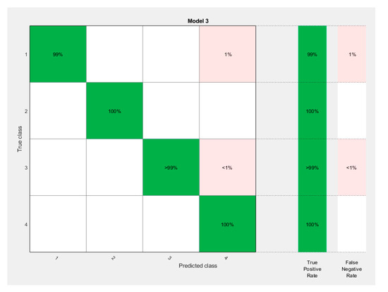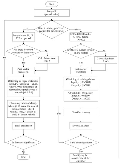 Testing the ANN-classifier algorithm on real data gave significant results as well. The accuracy was 98%. The excessively high accuracy of the results is due to the idealized conditions of the experiment. Under real-life conditions, the machine can be subject to several types of defects [45]. It may operate under disturbing conditions and at different modes. This paper has shown the validity of the proposed methodology, however, for real objects it may not give such high results. However, the authors believe that in order to make it applicable to real objects it is necessary to break the Park hodograph into smaller abstract zones. This would solve the problem of possible overlapping distortions of Park’s vector.