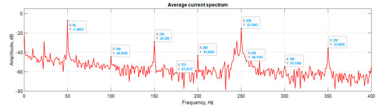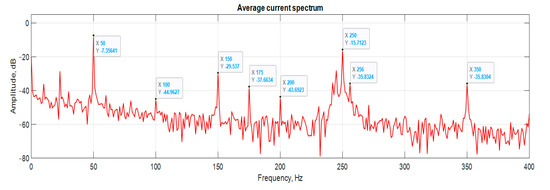 Compared to spectrum analysis (FFT) [36], where part of the information is lost due to the use of low and high-pass filters and is in the noise region (−75–80 dB), it is almost impossible to detect the initial stages of the defect. The occurrence of a defect (in our case a bearing defect) in the hodograph can be detected earlier as a distortion in its trajectory (Figure 10), which the spectrum does not provide. The expected calculated bearing fault frequencies according to (6) and Table 2 at cos β = 1 are frb = 175 Hz, 256 Hz. By analyzing the hodographs and spectra (Figure 10, Figure 11, Figure 12, Figure 13, Figure 14 and Figure 15) changes in the current hodograph (Figure 10) are observed as the defect degree changes. However, it is difficult to isolate the peaks of the frequency components of the spectrum, which is an advantage of the generalized current vector method. However, due to the visual identification of faults in the trajectory distortion hodograph, it is not possible to construct a fault-level estimation system.