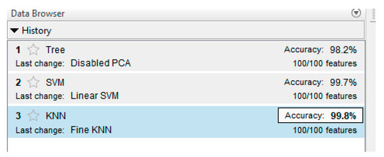Figure 18 shows the results of training the ANN-classifier. The classifier was trained using three methods: Decision Tree [42], Support Vector Machine [43] and K-nearest neighbors [44].