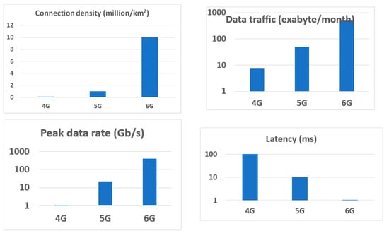 Within literally one generation, the Internet revolutionized our lives and proved to be a lifesaver during the COVID-19 pandemic. The wireless communication during the pandemic increased about 40%. Teleconferencing increased by about 300% []. It was mostly enabled by one material—silicon—and by one device—the field-effect transistor—albeit with a lot of help from germanium, III–V, and some other materials. We now use 4G and emerging 5G technology, but the 6G communications will be another transformational jump in communications (see Figure 1). 6G will raise applications in telemedicine, teleconferencing, defense, industrial controls, cyber security, the Internet of Things, autonomous unmanned cars, robotics and stay-at-home work and conferencing to a much higher level [,,,,,,,,,]. 6G will expand the wireless high-speed communications to the space, sea, and upper atmosphere.
