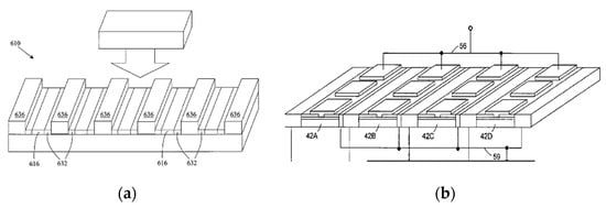 Figure 6 shows two possible implementations of the plasmonic boom structures. The plasmonic boom instability [,] occurs when the electron velocity exceeds the plasma velocity. It is similar to the sonic boom occurring when a jet achieves a supersonic velocity. In a plasmonic crystal, such instability should be very effective if the electron drift velocity repeatedly goes higher and lower than the plasma velocity. In the structure shown in Figure 6a, the plasma frequency is modulated via having the periodic pattern of varying electron densities. In contrast, the structure shown in Figure 6b corresponds to the same plasma frequency spectrum in all the regions. However, the electron drift velocity is higher in narrower regions and smaller in the wider regions. Using narrow protruding regions called plasmonic stubs allows for the phase control in plasmonic 1D, 2D, and 3D plasmonic crystals, schematically shown in Figure 7. The stubs could be gated as shown in Figure 6 and, therefore, tunable, allowing for the optimized phase relations [].