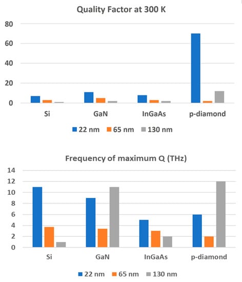 The quality factors in Figure 3 are much smaller than that for the photonic crystals operating in near infrared or visible range and using, for example, gold nanoparticles []. Moreover, the values in Table 2 represent the upper bound of the quality factors of the THz TeraFETs that could be achieved. Parasitic elements [], surface scattering [], quantum reflection [] from the contact regions all conspire to reduce the quality factors. Oblique waves were mentioned as another reason for the quality factor reduction [], which, however, was not confirmed by numerical simulations []. For example, the calculation in [,] predicts the quality factor for InGaAs at 77 K of 18. In fact, the measured quality factor at 110 K was 1.4 []. The resonant behavior for Si TeraFETs at room temperature for the 20 nm NMOS (Q = 7) is predicted for 11 THz, which is a larger frequency that the optical phonon frequency in Si (~8 THz). At such frequency, coupling with lattice vibrations should be accounted for. However, the data in Figure 3 provide the guidance for searching for the resonant plasmonic response at room temperature.