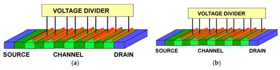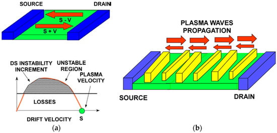Figure 5, Figure 6, Figure 7 and Figure 8 show different plasmonic crystal implementations proposed for detecting, processing, and generating the THz radiation. Figure 5 illustrated the Dyakonov–Shur (DS) instability mechanism [] that relies on the difference in the reflection coefficients from the channel boundaries due to the differences in the velocities of the plasma waves propagating from the source to the drain (s + v) and reflected from the drain (s − v). Here, v is the electron drift velocity. The largest increment corresponds to the boundary conditions of the short-circuited source and open drain. Having finite impedances at the source and drain reduces the increment [,].