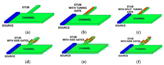 Stubs for tuning: (a) ungated stub; (b) stub with a single tuning gate; (c) stub with a split tuning gate; (d) stub with side gates; (e) stube with side gates and top gate; (f) stub with side gate and two top tuning gates.