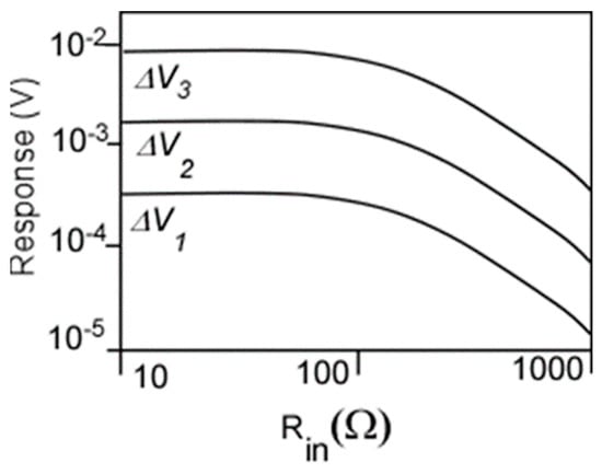 The idea of adjusting the phase shifts in the unit cells of a plasmonic crystal for the vector detection of generation could be also applied to a travelling wave amplifier concept [] (see Figure 9). Feeding the phase-shifted terahertz (THz) signal into the stages of a TeraFET amplifier dramatically increases the response (see Figure 10). The number of stages is only limited by the THz beam cross-section. As seen from Figure 10, this “traveling wave amplifier” approach enables orders of magnitude enhancement in the THz detector responsivity.
