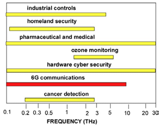 TeraFET technology will also enable THz applications including astronomical science [,,], earth observation [], sensing [,,], chemical analysis [,], homeland security, concealed weapon and explosive detection [,], industrial controls [,], compact radars [,], structural integrity testing, spacecraft tiles control [], Internet of Things (IoT), biotechnology [,,], medicine [,], including cancer diagnostics [], and non-destructive VLSI testing during the manufacturing process [] and in-situ checking of the THz scans of chips [,,,,]. Artificial intelligence processing of the VLSI THz scans allows distinguishing between genuine and fake VLSI for hardware cyber security applications []. Figure 11 shows the THz frequency ranges for different applications of the THz technology.