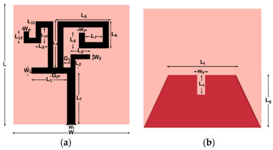 Various types of multi-band antennas, such as dipole, patch, monopole, and dielectric resonator, have been proposed in the literature [3,4,5,6,7,8,9,10,11,12]. For WLAN/WiMAX applications, E-shaped [8], slotted triangular-shaped [9], asymmetric T-shaped [10], half mode substrate integrated cavity [11], and coplanar waveguide (CPW)-fed rectangular-shaped [12] dual-band antenna structures were presented. Several triple-band monopole antenna structures were also reported in the literature [13,14,15,16,17,18,19,20]. A Y-shaped radiator with a dual ring resonator [13], a Y-shaped radiator with an L-shaped slit etched from the ground plane [14], a rectangular patch integrated with a step-shaped microstrip feed line [15], L-shaped and T-shaped radiators [16], a T-shaped resonator with an open slot etched from the ground plane [17], rectangular patch with two symmetrical E-shaped slots etched from the ground plane [18], multibranch strips [19], and overlapping strips [20] were proposed for LTE, WiMAX, and WLAN applications. In the literature, a few quad-band monopole antenna configurations were also investigated [21,22]. Inverted L-shaped monopole with microstrip line feeding [21] and meandered line-based monopole [22] antennas were presented for LTE, WLAN, WiMAX, and INSAT-C applications.