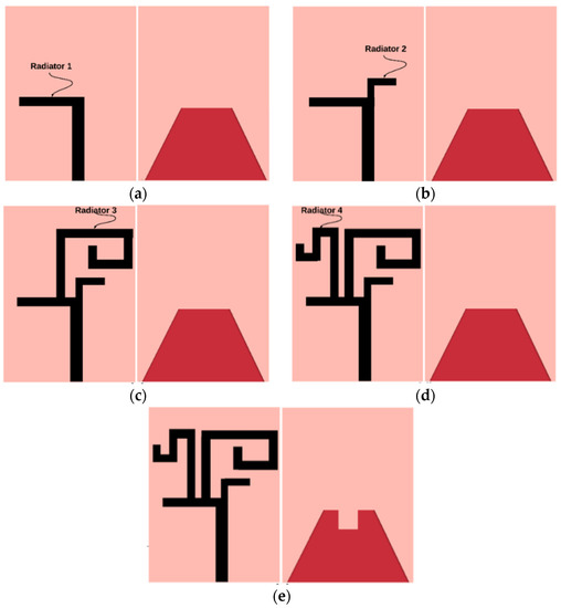 where C is the velocity of light in vacuum, fri is the resonating frequency, and ɛeff is the effective dielectric constant of the substrate. The antenna-1 is composed of a monopole radiator (radiator-1) integrated with a 50 Ω microstrip feed line and a tapered ground plane, as depicted in Figure 2a. The reflection coefficients of the quad-band antenna design steps are depicted in Figure 3. It is noticed that the antenna-1 resonates at 4.9 GHz.