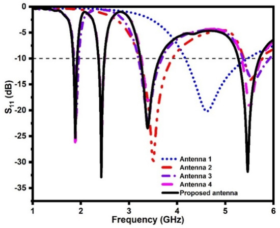 Reflection coefficients of the quad-band antenna design stages.