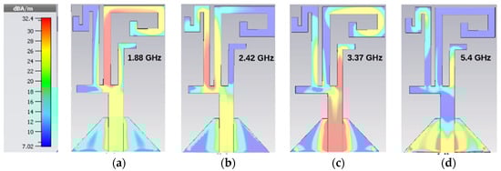 Surface current distribution at (a) 1.88 GHz, (b) 2.42 GHz, (c) 3.37 GHz, (d) 5.4 GHz.