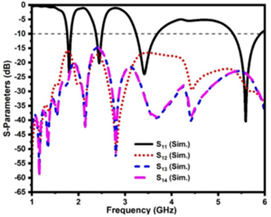 The front view and back view of the proposed DS MIMO antenna are shown in Figure 5. The proposed MIMO antenna employs the double-sided radiator placement method to improve antenna element isolation. Two radiators and two ground planes are located on the front side of the substrate, as shown in Figure 5a, and the other two radiators/ground planes on the back side, as shown in Figure 5b. The four identical antenna elements are also arranged orthogonally to one another. The size of the DS MIMO antenna is 60 mm × 60 mm. The simulated reflection coefficients of the DS MIMO antenna are illustrated in Figure 6. The proposed MIMO antenna resonates at 1.88 GHz, 2.42 GHz, 3.37 GHz, and 5.4 GHz, and the isolation between antenna elements is more than 15 dB. It is evident that the double-sided placement of the antenna elements improves isolation significantly.