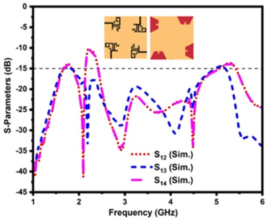 Whereas in conventional MIMO antenna design, the four radiating elements are placed on the same side of the dielectric substrate, and the isolation between them is not impressive, even though the radiators are orthogonal to each other, as illustrated in Figure 7. The conventional MIMO antenna has a mutual coupling of less than −15 dB and −10 dB in the operating bands.