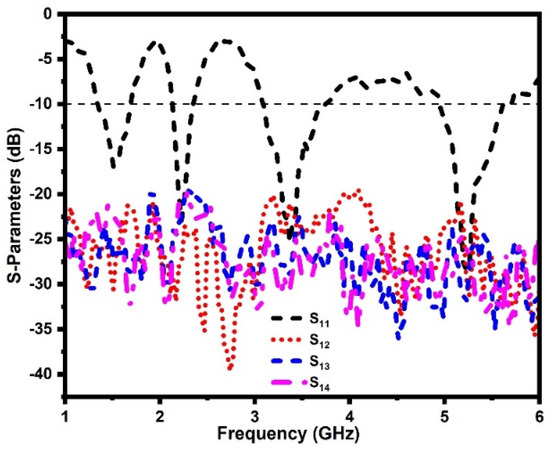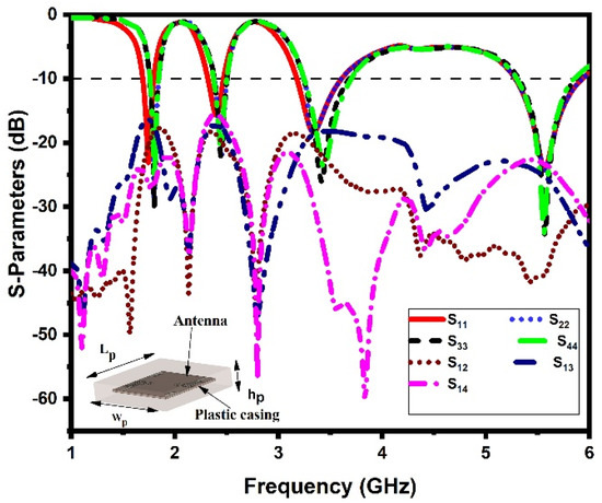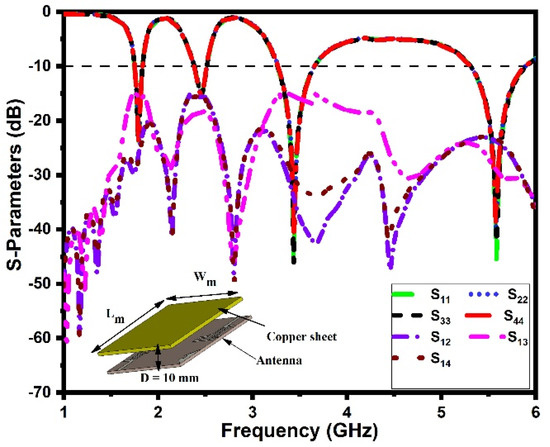 The performance of the antenna should remain unchanged after mounting it on the host device. In this section, the antenna-in-packaging performance of the proposed DS MIMO antenna is investigated under two different scenarios. In the first scenario, the antenna is placed under a copper sheet (with dimensions of Lm × Wm = 60 mm × 60 mm) at a distance (D) of 10 mm, and in the second scenario, the antenna is placed inside a plastic casing (with dimensions of Lp × Wp × hp = 70 mm × 70 mm × 10 mm) [35,42]. The corresponding S-parameters (reflection coefficients and mutual coupling) of the proposed antenna in two different scenarios are shown in Figure 14 and Figure 15. It is noted that the proposed antenna exhibits quad-band performance even when placed under a copper sheet and plastic casing in the near-field region. Hence, the copper sheet and plastic casing have a minimal effect on antenna performance, confirming its stable working in IoT devices.