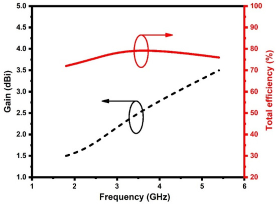 Figure 10 represents the measured gain and efficiency of the DS MIMO antenna. The antenna gain varies from 1.5 to 3.6 dBi, and the efficiency varies from 72 to 81%. The peak gain and efficiency achieved at 1.8 GHz, 2.4 GHz, 3.4 GHz, and 5.4 GHz are 1.5 dBi (72%), 2.5 dBi (75%), 2.8 dBi (81%), and 3.6 dBi (76%), respectively.