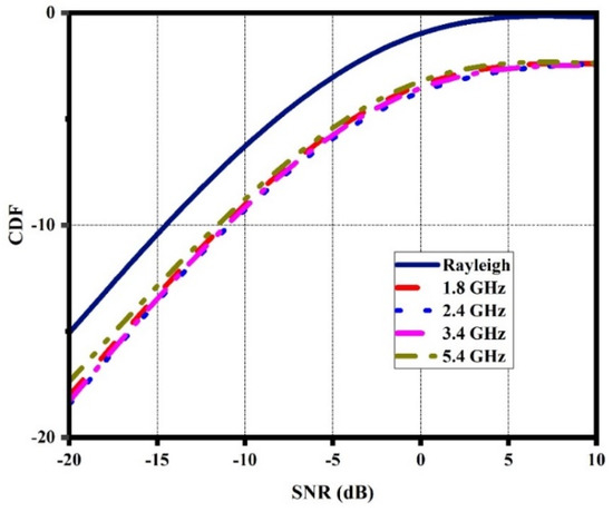 CDF is an important metric for evaluating the diversity performance of a quad-port MIMO antenna in the Rayleigh fading scenario. [41]. The CDF at various frequencies can be calculated using Equations (11) and (12). The CDF values of the DS MIMO antenna are shown in Figure 13.