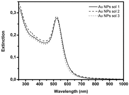 The synthesis of Au NPs is very reproducible, as demonstrated by the UV-Vis spectra of three different solutions, reported in Figure 3, showing good overlap. The stability of the Au NP solutions was also tested through Z-potential measurements: values of about −40/−45 mV were obtained, confirming the high stability of these NPs in solution.