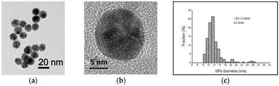A first measurement of the particle radius was performed through dynamic light scattering, giving a hydrodynamic radius of R1(DLS) = (58 ± 8) nm. The radius of the TEM analysis returned a smaller radius of R1(TEM) = (46 ± 3) nm, as can be observed in Figure 4. The final concentration of NPs, calculated from the average diameter extracted by TEM analysis (14 nm), is approximately 7∙1012 NPs/mL.