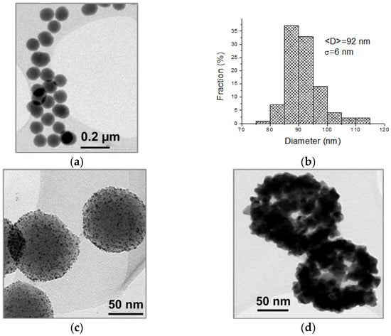 The solution of small Au NPs obtained had a concentration of 4∙1014 NPs/mL, calculated by estimating the radius of NPs 1 nm. The homogeneous decoration of the silica cores with gold nuclei is visible in the TEM image of Figure 5c.
