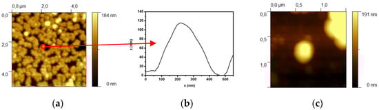 The SiO2@APTMS particles were also analyzed by AFM; Figure 6a shows a high particle density, where the particles tend to aggregate in a hexagonal closed-packet conformation. However, particle diameters could be measured through appropriate software by extracting the nanoparticle profile, shown, as an example, in Figure 6a. From a statistical measurement of 10 profiles extracted from the AFM image, a particle dimension of (122 ± 11) nm was calculated.