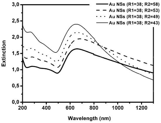 UV-Vis-NIR spectra of four different Au NSs (R1 = 38; R2 = x) samples.