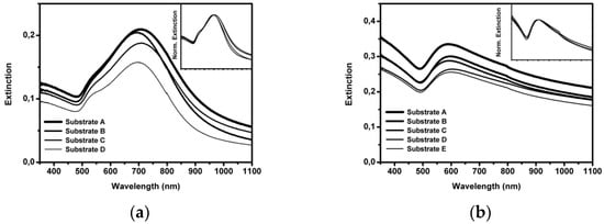 Extinction spectra of different Au NP substrates (a) and Au NS (R1 = 38; R2 = 49) substrates (R1 = 38; R2 = 49) (b); normalized spectra in the insets.