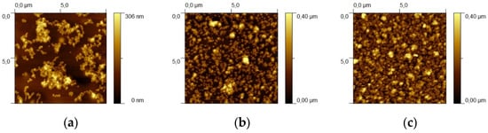 In the case of Au NS substrates, the realization of substrates at varying NS concentrations was tested through AFM. The AFM images on Au NS (R1 = 46; R2 = 69) substrates, realized with three different Au NS concentrations, are shown in Figure 9.