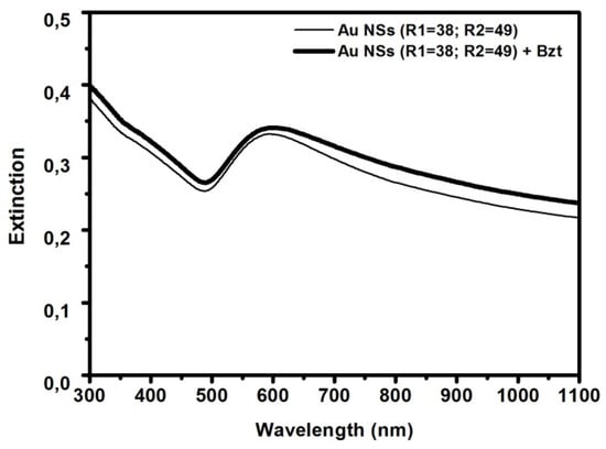 Extinction spectrum of Au NSs (R1 = 38; R2 = 49) before and after functionalization with benzenethiol.