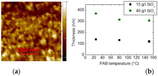 The thickness of the sol-gel film was tested as a function of baking temperature: It can be observed that, depending on the amount of SiO2, higher post-application bake temperatures (PAB) can also cause a decrease in film thickness.